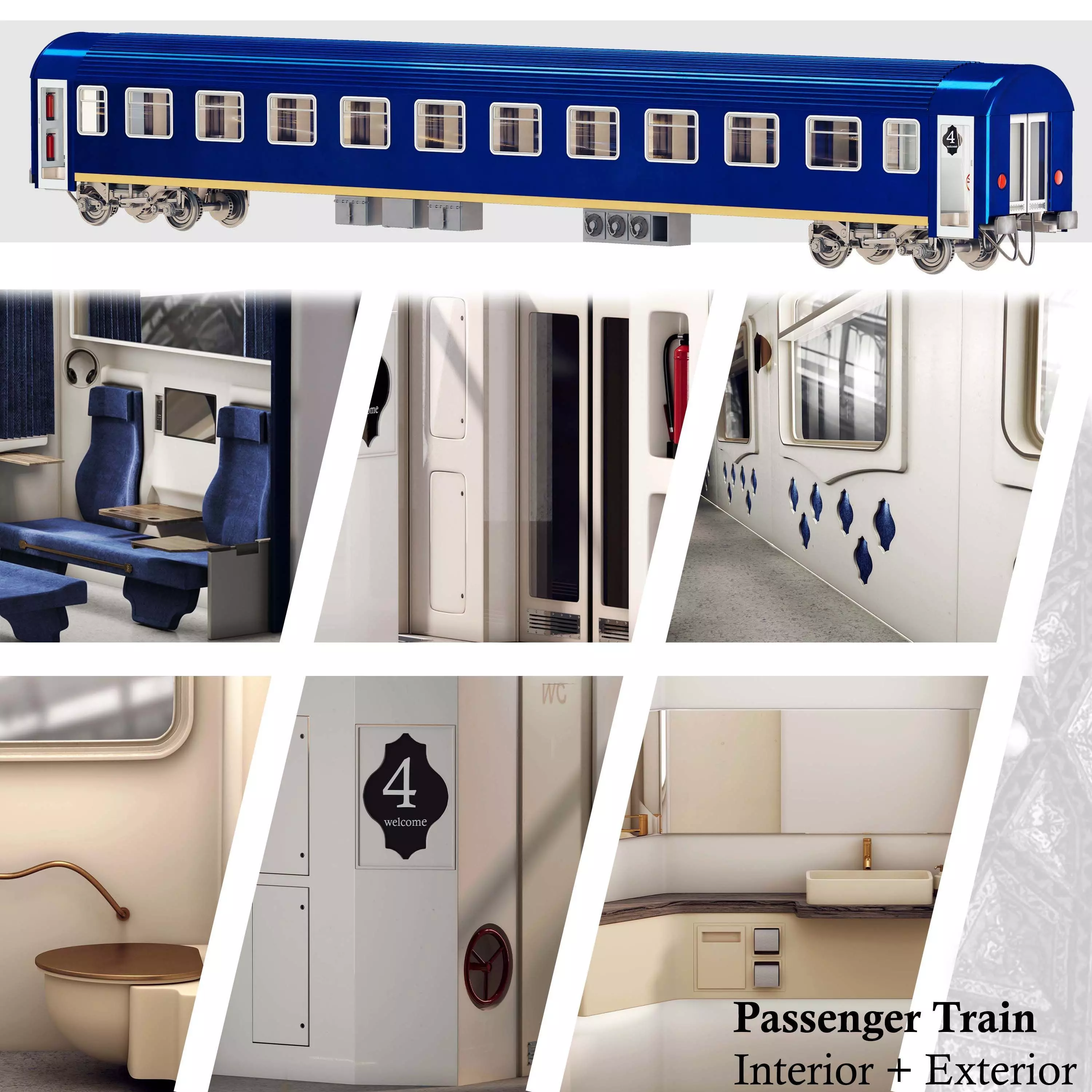Name: passenger train 01Format: 3Ds Max 2013-2018Export: OBJ,FBX, 3DS, MATRender: VRay (5.x), Corona (6)Polys: 783706Verts: 788423Units: CentimetersDimension: 298 x 2627 x 415Low - Poly Interior & Exterior Passenger TrainNo N-gonsNone-overlapping UVsPassenger Train with interior (Coupe - Seats, TV, Toilet, Doors, Curtains, Coffee table, Headset, Trash bin, Remote control, Lighting and hidden lights,WC,Fire extinguisher, Bogie, Evaporator, Electrical boxes, Separate space for luggage )Available formats: - 3ds max 2013 (.max) - OBJ (.obj and .mtl) - Autodesk FBX (.fbx) Highly detailed exterior, detailed interiorPictures are rendered in 3Ds MAX with V-Ray renderer.This train is modeled in real world scale.The bogies (train wheels) are made up of 273000 polygons, but you can make it much lighter and have fewer parts because it is modeled in detail.All parts are unwraped in RizomUVYou can use this passenger train both for day mode and for sleep mode