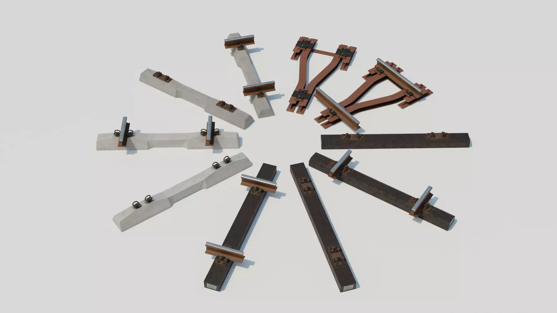 The models were created based on sleepers used on European railroads. The rail gauge is 1435mm and the distance between sleepers is 0.6m. The models were designed to easily create tracks of any shape with no visible connections (for examples Array and Curve modifier in Blender). Each sleeper was modeled in two versions - with or without a rail. Models have been optimized for polygon count.