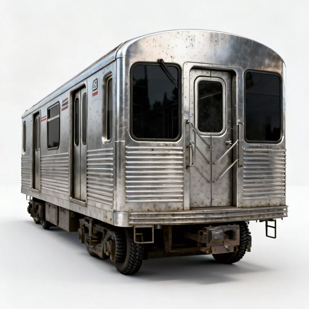 Weathered Stainless Steel and Industrial FinishThe train car features a primary body finish of heavily weathered brushed stainless steel, meticulously modeled with authentic surface pitting, deep environmental staining, and prominent years-of-service tarnish. This professional and grounded appearance provides a clear visual story of a transit unit operating through a busy metropolitan network, providing a sharp visual contrast against the dark-tinted passenger windows and the heavy-duty rusted mechanical undercarriage.