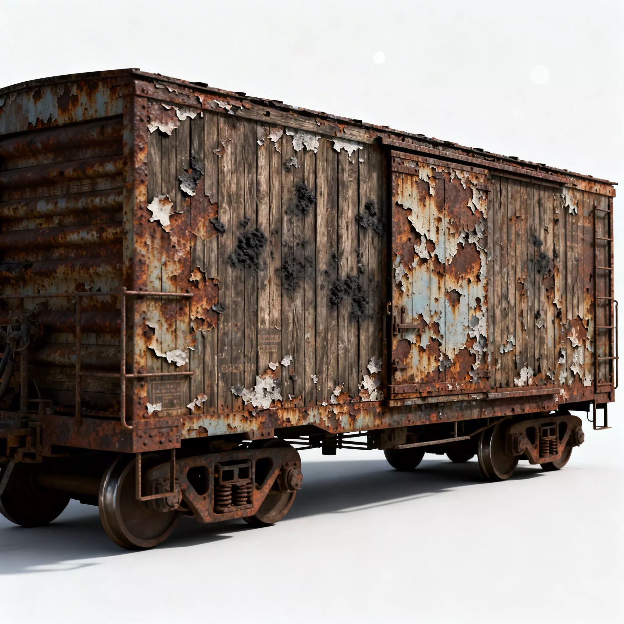 Weathered Wood-Slat and Flaking Blue Paint FinishThe car features a primary body finish of weathered vertical wooden slats and heavily oxidized industrial steel, meticulously modeled with realistic surface wood-grain, massive flaking of old blue paint, and prominent iron-oxide pitting. This long-term-abandonment aesthetic provides a professional and grounded appearance that tells a clear story of decades of environmental exposure and thermal insulation failure, providing a sharp visual contrast against the dark soot-stains on the panels.