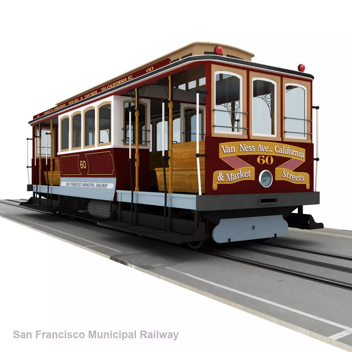 These days there are only two fleets still in service. One of these is Powell-Hyde and Powell-Mason, while the other is California Street. This model is a reproduction of car No. 60, of the California Street fleet, built by MUNI (San Francisco Municipal Railway) in 1998 this car was brought into service in 2002.