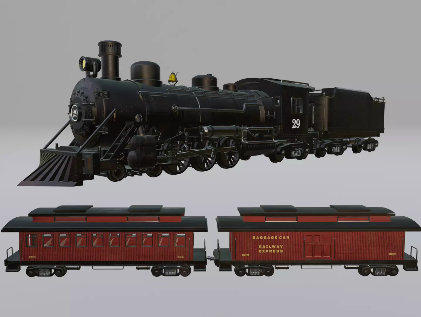 This is a Steam Train model with Passenger Wagons. The model includes Steam Locomotive, Coal Tender, Passenger Wagon, Baggage Car and Railway. The models are unwrapped and the textures are 4096x4096 resolution. All textures and materials are included. The model is rigged in blender.