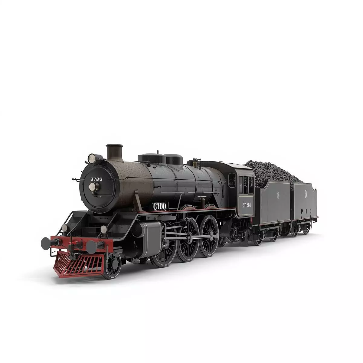 The model depicts a heavy-duty steam engine rendered in classic matte black and dark grey, accented by a striking red cowcatcher at the front. It features a fully modeled coal tender car trailing behind, piled high with fuel. The mechanical complexity is on full display, with intricate connecting rods, pistons, and spoked driving wheels that look ready to hiss and chug down the tracks. Distinct markings like 8720 and C100 add a layer of authentic identity.