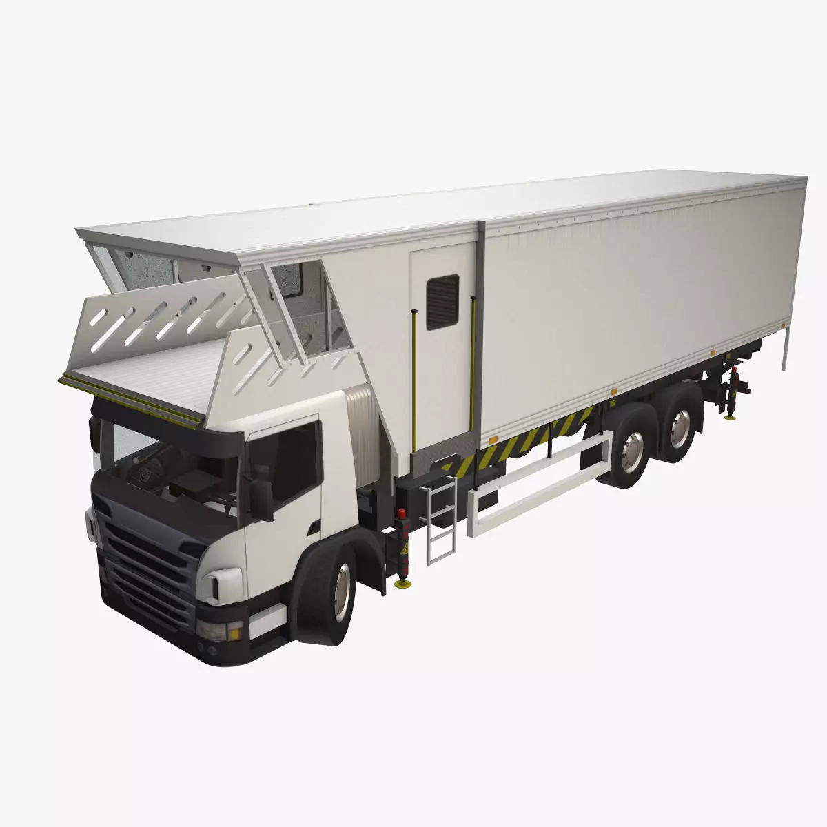 Animation name : FramesDemo : 0-210Wheels_Spin : 220-270Wheels_Steering_Right : 270-320Wheels_Steering_Left : 330-380Outriggers_Extend : 390-440Outriggers_Lifting : 440-490Cargo_Lifting : 490-590Roof_Sliding : 590-640