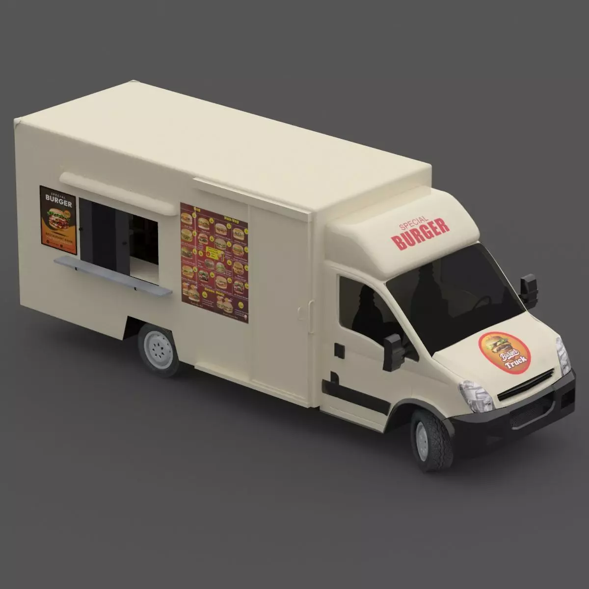 This ''Burger Truck' is a high quality, photo real model that will enhance detail and realism to any of your rendering projects, detailed design that allows for close-up renders, and was originally modeled in 3DS MAX 2017 and rendered with V-Ray 4