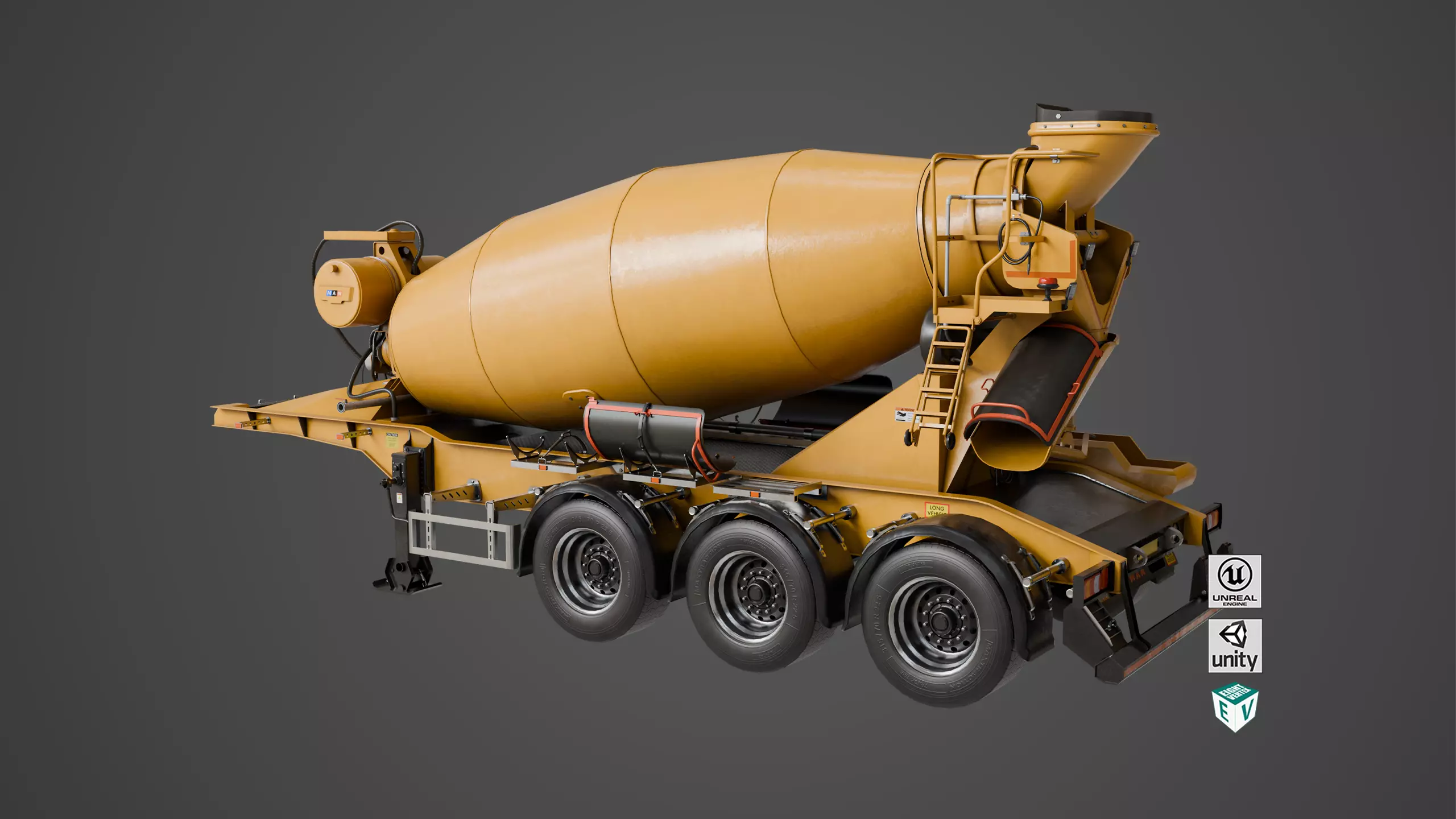 The Photorealistic 3D model of Cement Mixer Yellow Trailer Rigged, This model is suitable for any visual production - broadcast, high-res film close-ups, advertising, games, design visualization, forensic presentation, etc
