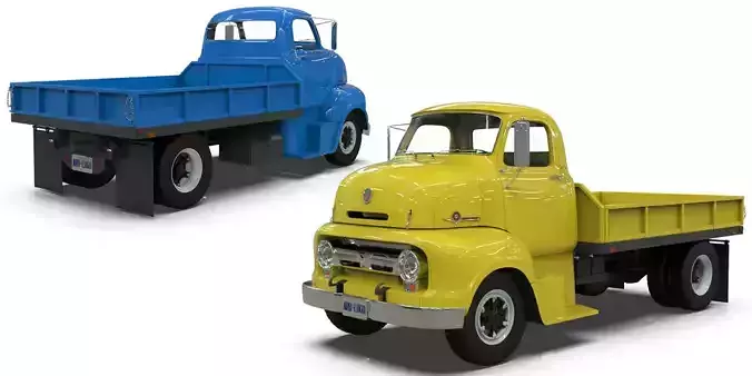 This is a high-quality 3D model of a classic 1950s Cab-Over-Engine (COE) Platform Dump Truck. Meticulously modeled in Blender from blueprints, this asset is optimized for digital use in video games, simulations, architectural visualizations, and animated films.