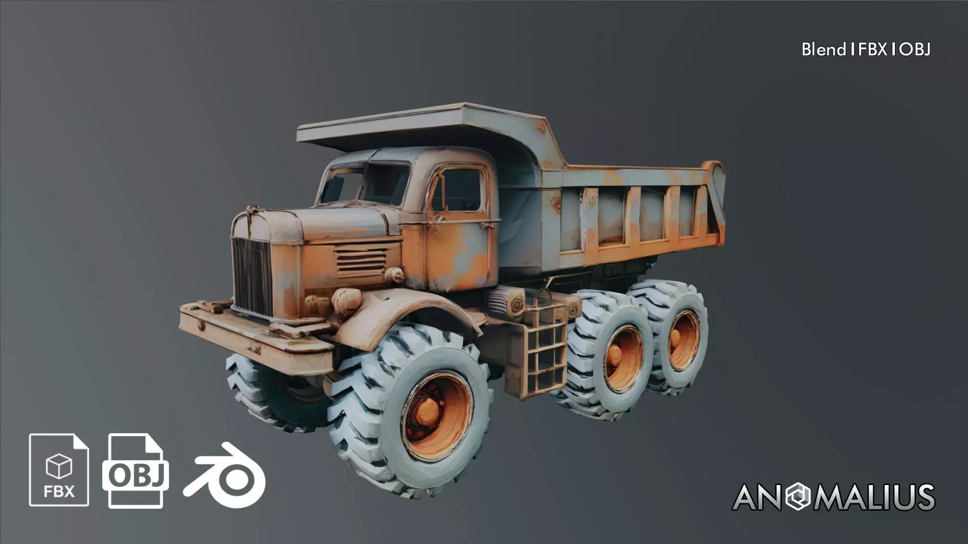 vintage dump truck 3D model with a rugged, industrial design. Features detailed body panels, large off-road tires, and a worn paint finish with rust and dirt buildup. The heavy-duty dump bed adds functionality, making it suitable for construction, mining, or post-apocalyptic environments. Optimized for games and real-time use.