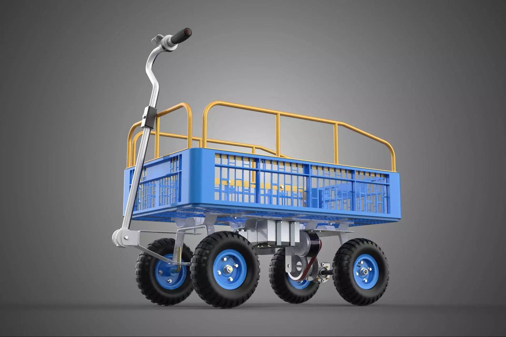 This detailed 3D model represents a specialized electric crate tray cart equipped with integrated safety rails, engineered for heavy-duty material handling within construction and building site environments. The unit features a reinforced flatbed tray designed to accommodate standard industrial crates and loose materials, providing a versatile solution for site logistics. A critical aspect of the design is the inclusion of robust perimeter safety rails, which ensure load stability during transit and prevent material displacement that could lead to workplace accidents. Powered by a high-torque electric motor and an integrated battery pack, the cart offers a sustainable, emission-free alternative to traditional internal combustion equipment, making it ideal for use in enclosed structures or noise-sensitive zones. The chassis is constructed from structural-grade steel with a weather-resistant powder coating, ensuring longevity against the abrasive dust and moisture typical of active construction zones. The model incorporates realistic mechanical components such as heavy-duty pneumatic tires for navigating uneven terrain and an ergonomic control handle with integrated safety switches. This digital asset is perfectly suited for architectural visualization, industrial safety training, and logistical planning simulations, offering high fidelity in both its geometry and surface textures. It adheres to standard industrial design principles, reflecting modern advancements in utility vehicle technology and site safety compliance.