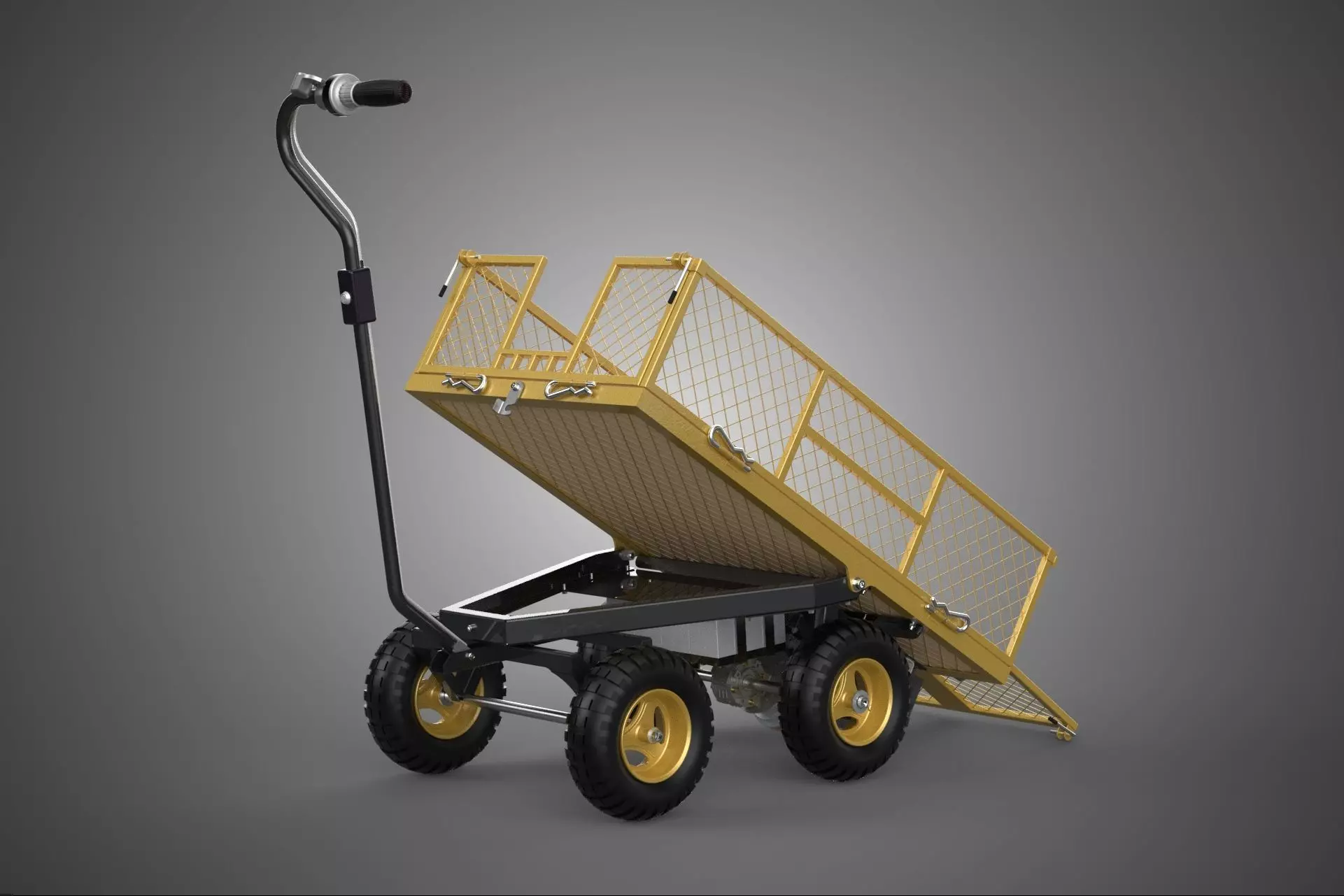 The fundamental principle involves an electric motor providing motive power to the wheels, enabling the device to transport loads without manual pushing or pulling. This motor is typically powered by a rechargeable battery pack (e.g., lead-acid, LiFePO4), offering emission-free operation suitable for indoor environments or noise-sensitive outdoor areas. Upon reaching the desired unloading point, a separate or integrated electric motor activates a tilting mechanism. This mechanism, which can be hydraulic (using an electric pump to pressurize fluid and extend a cylinder), electromechanical (using a lead screw or linear actuator driven by an electric motor), or a geared system, raises one end of the bed, allowing gravity to discharge the material. Controls typically include a throttle for speed, steering mechanisms (e.g., handlebar, tiller, or steering wheel), and buttons or levers for activating the tilt function.