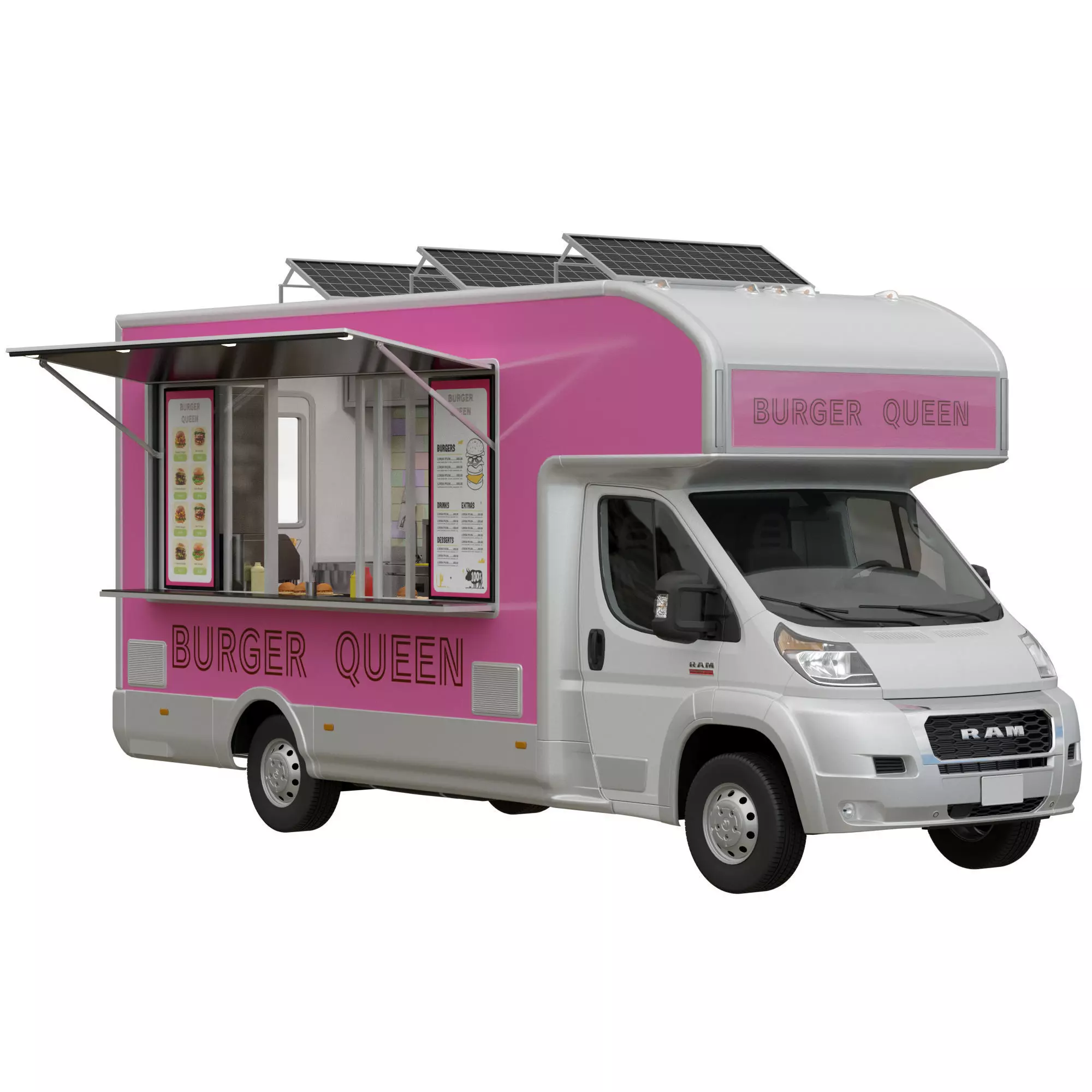 Food Truck RAM PROMASTER with kitchen equipment for cooking burgers, french fries.