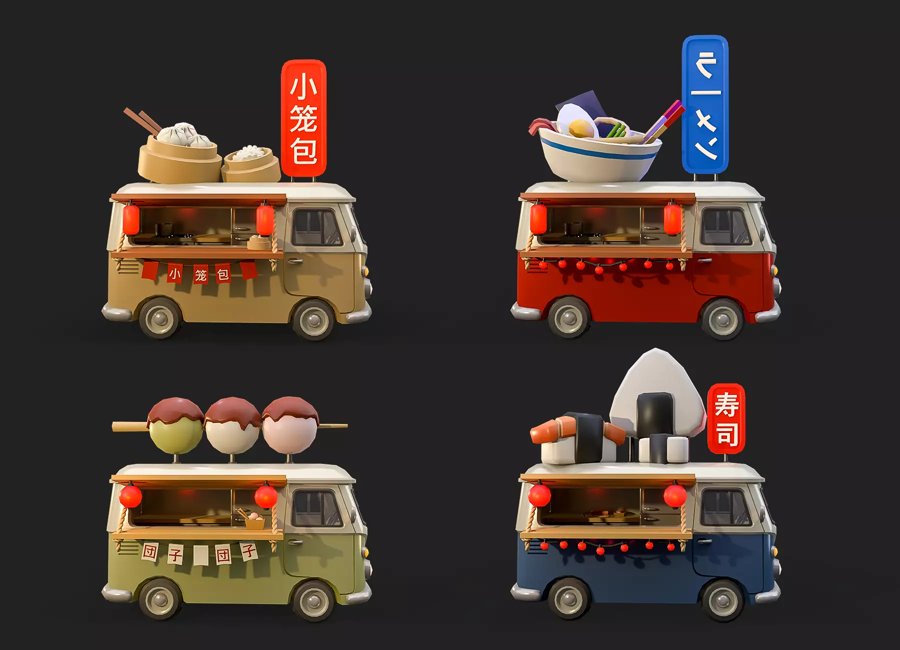 A set of four unique food trucks featuring various Asian cuisines, each embodying its own vibrant gastronomic mood and distinctive Eastern style. These models fit perfectly into projects where scene lightness and an expressive, cute design matter.The ideal low-poly pack for flat-color games.