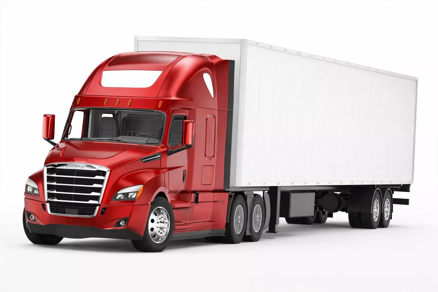 This Freightliner Cascadia truck 3D model represents a modern long-haul semi truck, engineered with a strong focus on aerodynamics, efficiency, and contemporary design.The model features a sleek aerodynamic cab, integrated side fairings, high-roof sleeper configuration, and robust tractor proportions, accurately reflecting modern North American trucking aesthetics.