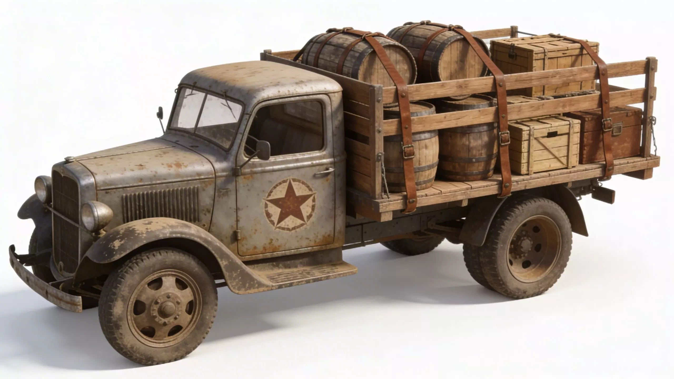 Cargo truck featuring a vintage cab design integrated with a high-capacity wooden slat cargo bed, perfectly capturing a Wild West or post-apocalyptic frontier aesthetic. The vehicle’s metal body is heavily weathered with realistic rust, dirt, and sun-faded paint, and features a prominent star emblem on the side door. The rear wooden bed is fully loaded with survival supplies, including multiple wooden barrels, crates, and storage trunks, all secured with detailed leather straps and metal buckles. Sitting on a dual-rear-axle chassis with treaded tires, this truck is designed for long-distance transport through harsh wasteland environments. This models is suitable for remesh and decimate.