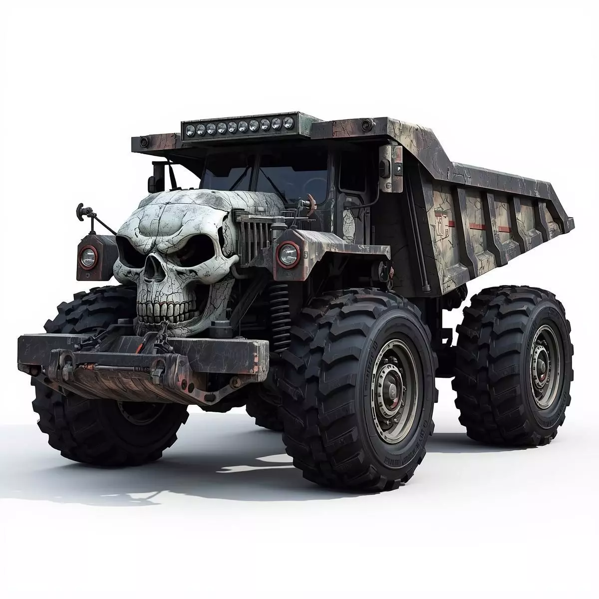 This high-quality 3D model features a massive industrial mining truck designed with a rugged, heavy-duty aesthetic. The vehicle is built on a reinforced armored chassis with a weathered gunmetal and matte finish, showcasing realistic metallic wear and industrial grit. The standout feature is the unique, custom-molded front grille inspired by bold geometric skull shapes, giving the truck a powerful and authoritative industrial presence.
