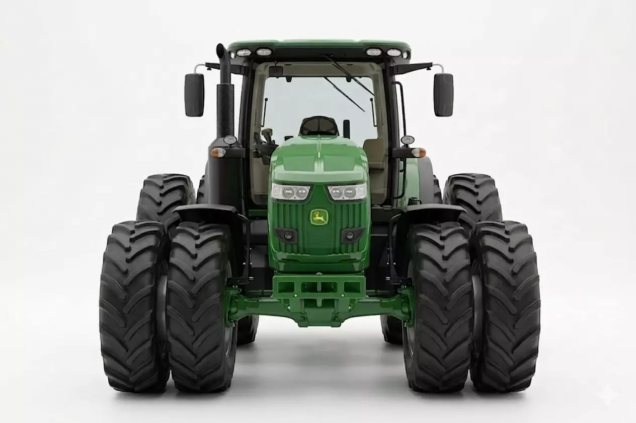 This high-fidelity 3D render showcases a John Deere 8R Series tractor, a powerhouse of modern industrial agriculture. Viewed from a direct frontal perspective, the vehicle exhibits its imposing stature and advanced engineering, featuring a massive dual-wheel configuration on both sides of the front axle for superior traction and reduced soil compaction. The tractor is finished in the iconic John Deere green and yellow livery, with a prominent vertical exhaust stack and a highly detailed front grille housing advanced LED lighting arrays. The spacious CommandView cab provides a panoramic field of vision for the operator, while the heavy-duty chassis and reinforced front-end components highlight its capability for high-intensity fieldwork. Set against a clean white background, this image emphasizes the clean lines and technical sophistication of one of the most recognizable pieces of farming machinery in the world.