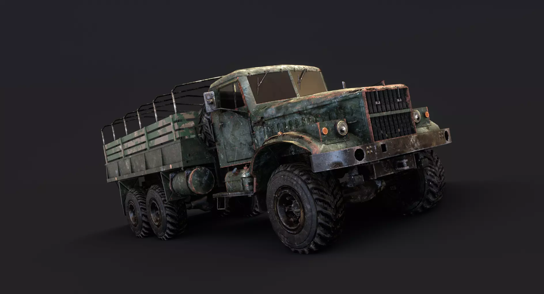 This is a low-poly model of the KRAZ 225 - a Russian military utility truck, slightly rusted and with heavy usage marks, suitable for environments with a post-apo and similar styles.