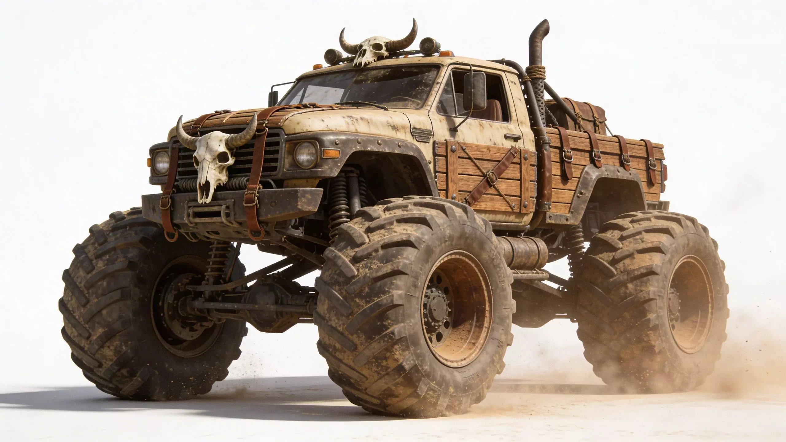 Tags:monstertruckdesertwastelandapocalypticskullwoodenarmoroff-roadmassive4x4raidersurvivalruggedindustrialvehicletransportdune