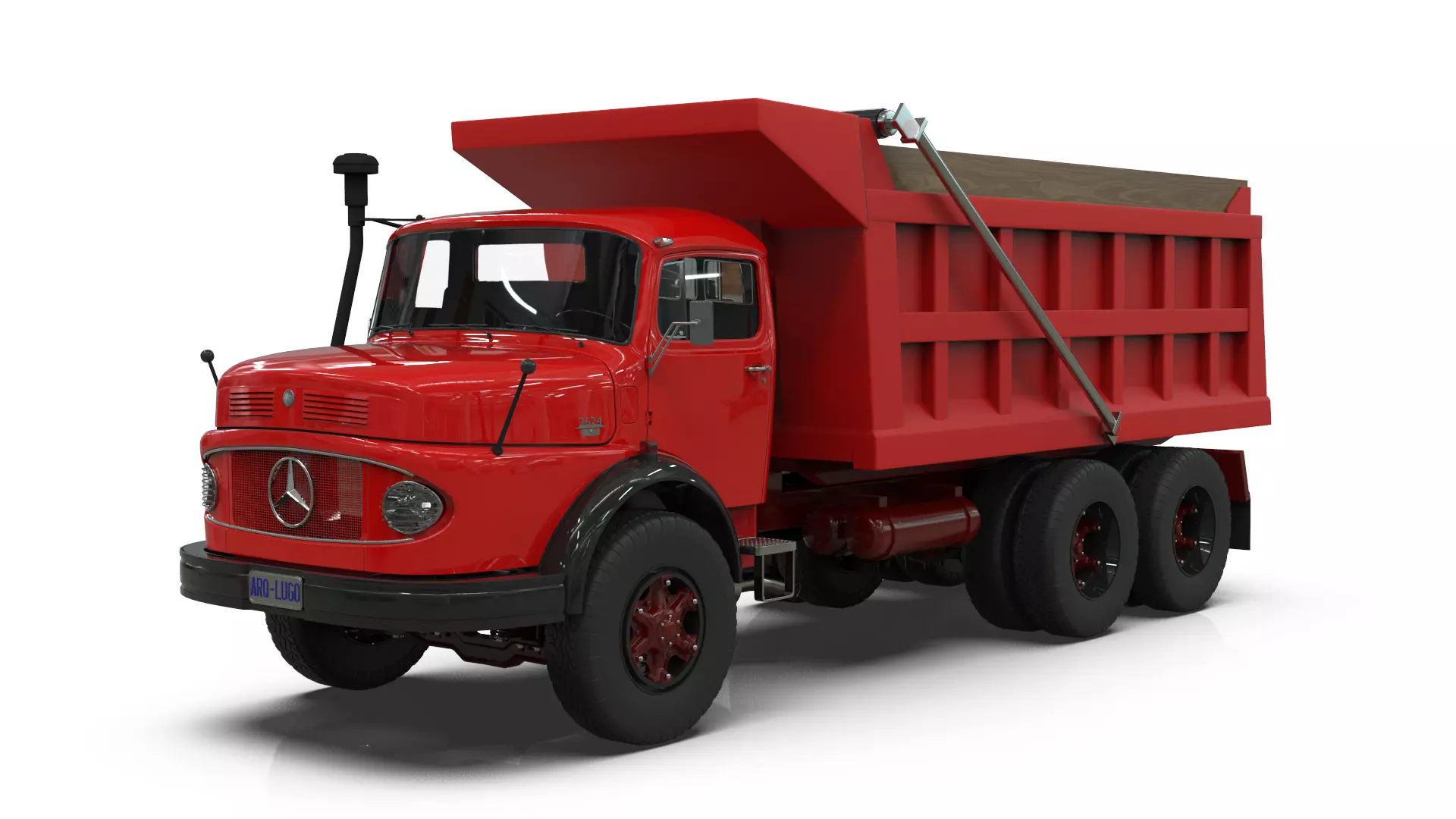 This is a highly detailed 3D model of a Mercedes-Benz 2624 configured as a heavy-duty dump truck, featuring a fully modeled and animatable telescopic piston system for realistic dump bed operation. Designed for maximum flexibility, the complete dump mechanism—including the hydraulic pistons, bed, and associated equipment—is logically separated into its own organized directory within the Blender file. This allows the asset to be utilized as a fully functional dump truck or as a standard chassis cab.