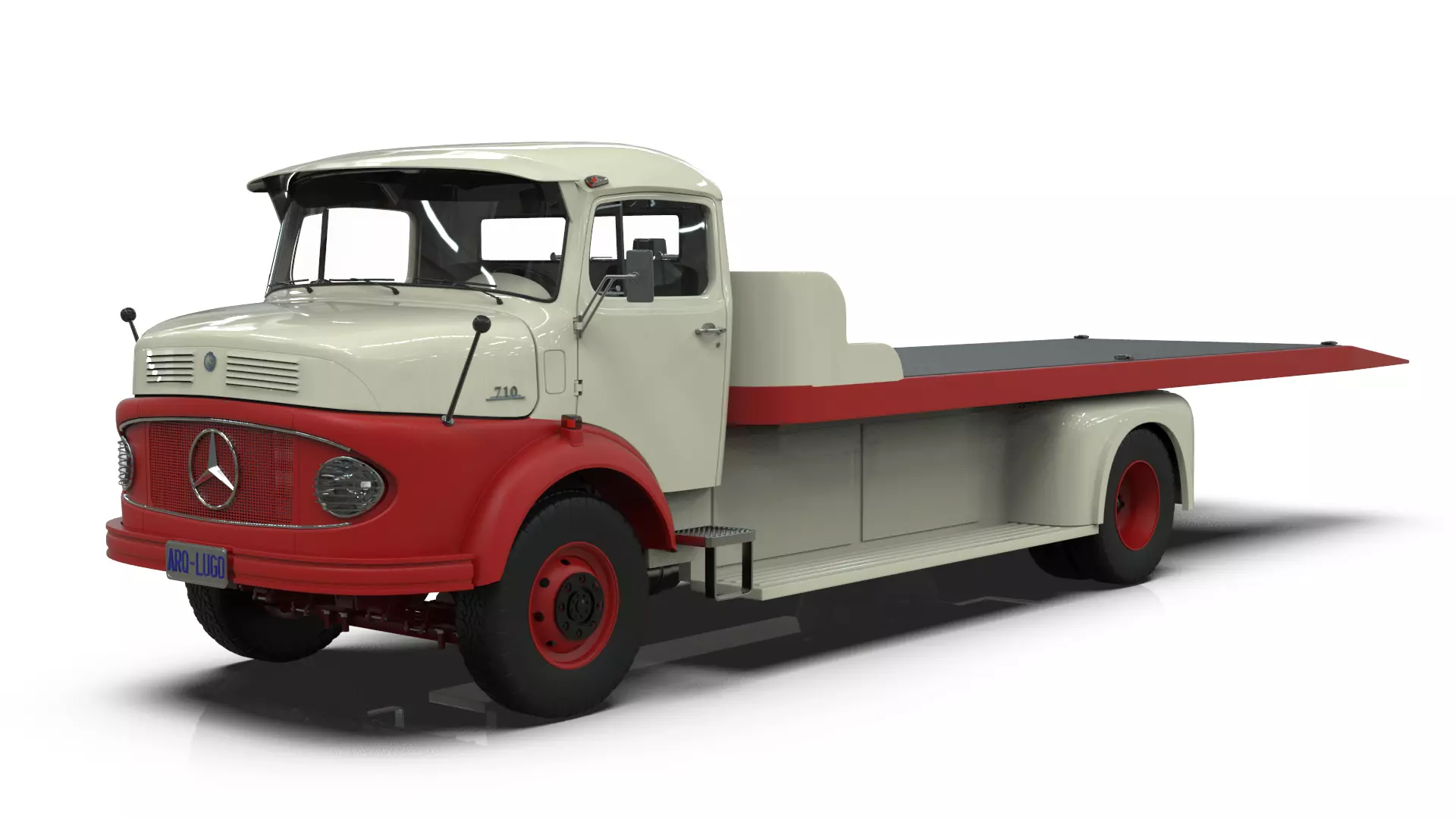 This is a detailed 3D model of a classic Mercedes-Benz LAK 710 4x4 truck from the 1970s, configured as a car carrier with an integrated Warn M8000 winch system. The asset features the complete car carrier equipment, including the tilting platform bed, which is logically separated into its own organized directory within the Blender file. This modular design provides maximum flexibility, allowing the model to be used as a fully equipped car carrier or as a standard 4x4 chassis cab by removing the carrier components.