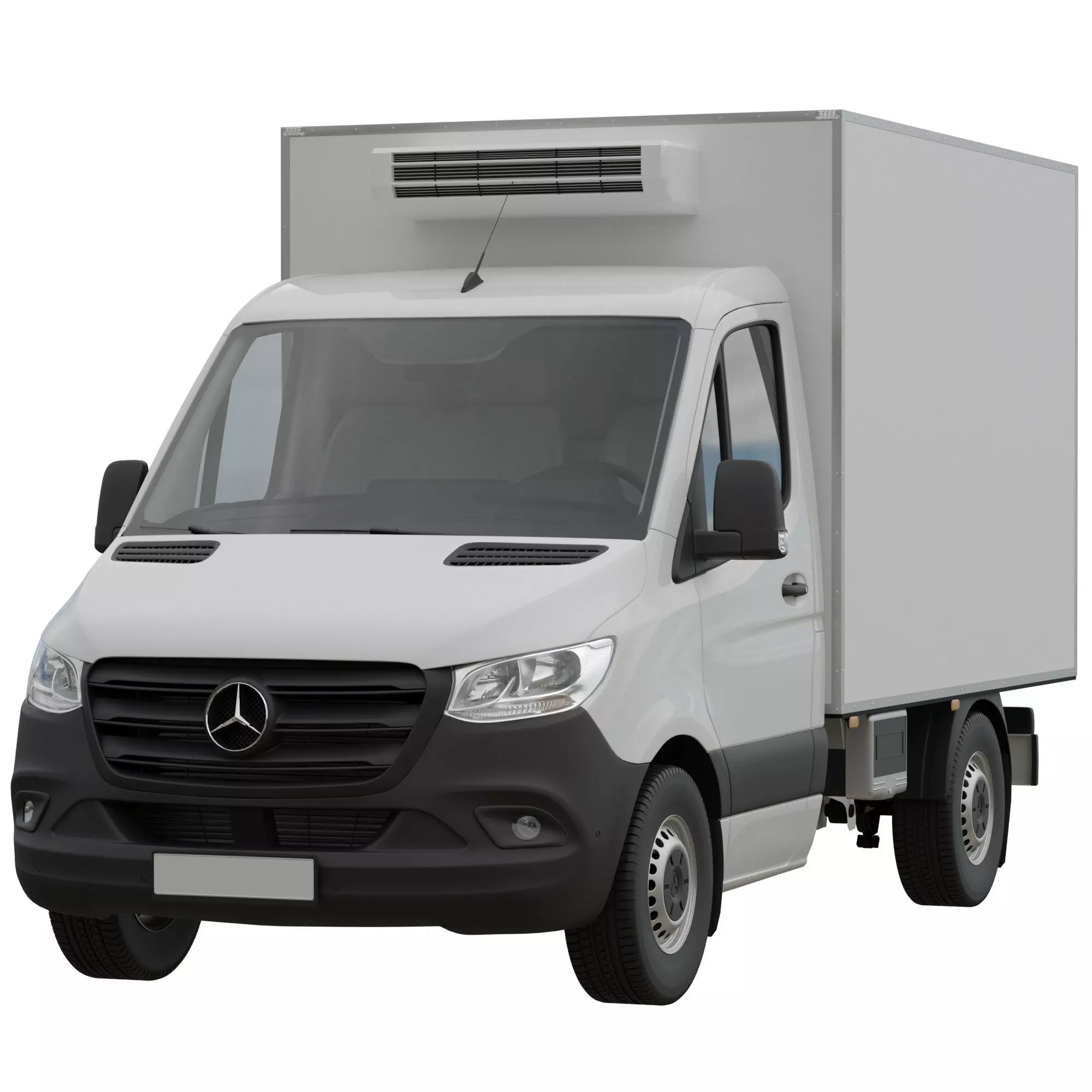 Mercedes-Benz Sprinter of the third generation (2018-…). Sprinter Chassis Cab Refrigerator L1. 3 vehicle lengths: compact, standard, long (L1, L2, L3). Available in max gross weights of 3000 kg, 3500 kg, 4100 kg and 5000 kg. Maximum payload 2675 kg for Sprinter with standard roof with a maximum permissible total weight of 5000 kg. Available rear and all-wheel drive options.