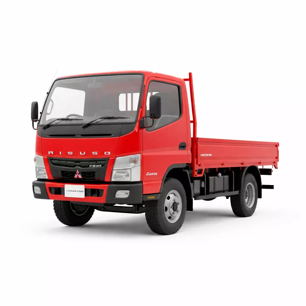 This highly accurate 3D model depicts a Mitsubishi Fuso Canter, a versatile light-duty flatbed truck widely used for urban logistics and short-haul deliveries. The vehicle is finished in a vibrant professional red, featuring a detailed three-seater cab with expansive glass for high visibility and the iconic Fuso front grille assembly. The rear is equipped with an open-access flatbed cargo area with low-profile drop-down sides, perfect for transporting construction materials or palletized goods. Realistic details include the chassis-mounted fuel tank, heavy-duty suspension, and multi-spoke industrial wheels. This asset is an excellent choice for city-building simulations, logistical training modules, or architectural visualizations requiring realistic commercial traffic.