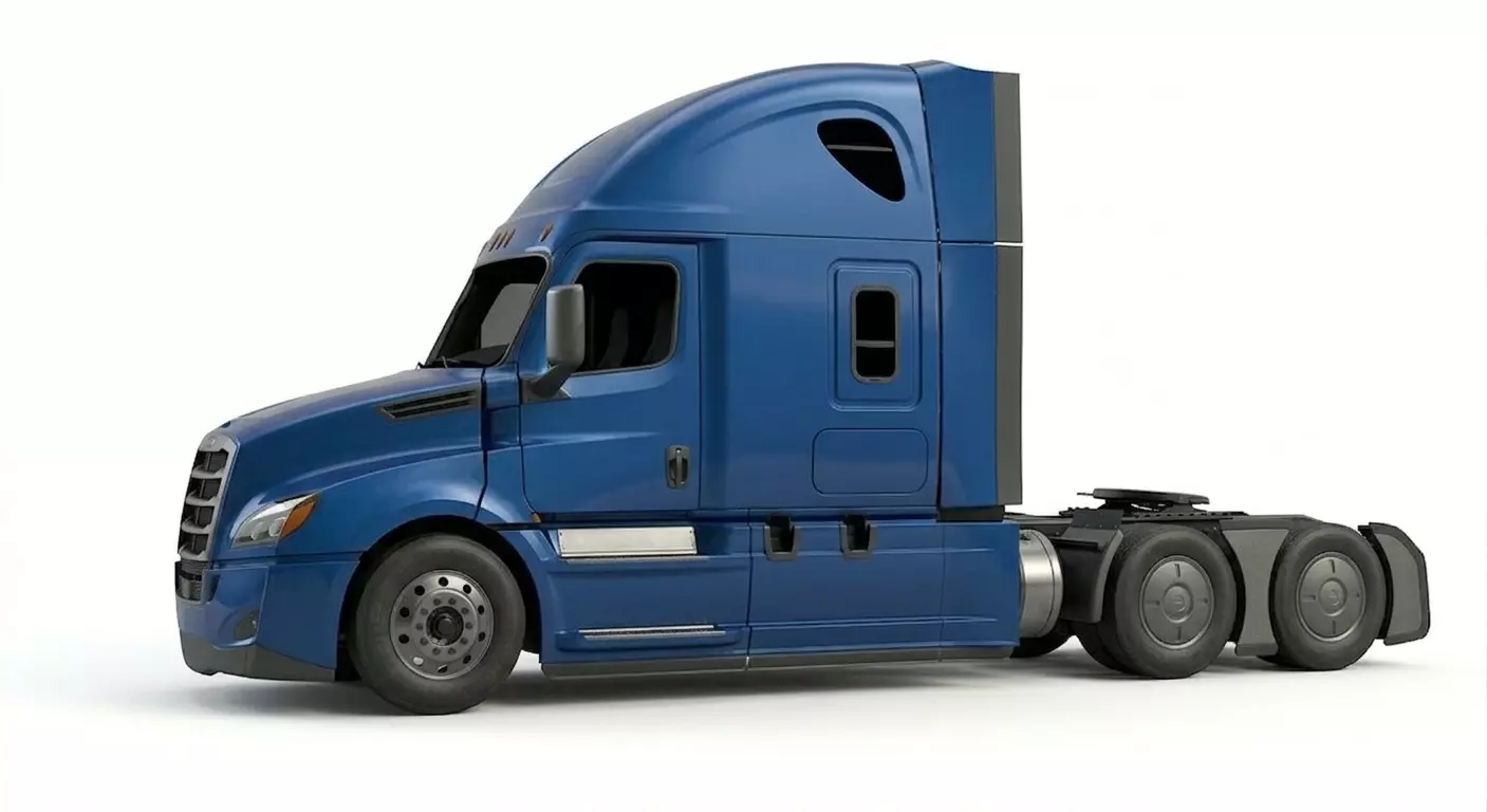 This high-precision 3D model features a modern long-haul semi-truck sleeper cab, designed with an emphasis on advanced aerodynamics and fuel efficiency. The model showcases a sleek, metallic blue finish and a streamlined high-roof silhouette integrated with side fairings and a detailed front grille. Key features include realistic headlight assemblies, side-view mirrors, and a fully modeled tandem-axle chassis with a fifth-wheel hitch for trailer attachment. The texturing captures high-end automotive details, from the rubber tire treads and chrome wheel hubs to the darkened privacy glass of the sleeper compartment windows. This asset is an ideal choice for logistical visualizations, transportation simulations, or as a hero vehicle in contemporary open-world gaming environments.