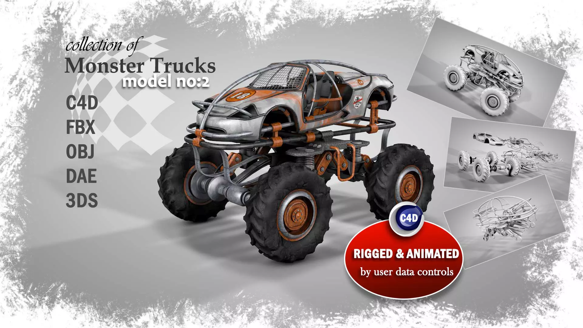 This is the second model of my monster trucks collection. This one should be a badass one. Gym couples like it so much. Source Cinema file has hundreds of objects and most of them still parametric. You can find and change their values to make the model looks some different. Except this source file, others have connected objects and baked textures. Need help? Please contact me asap.
