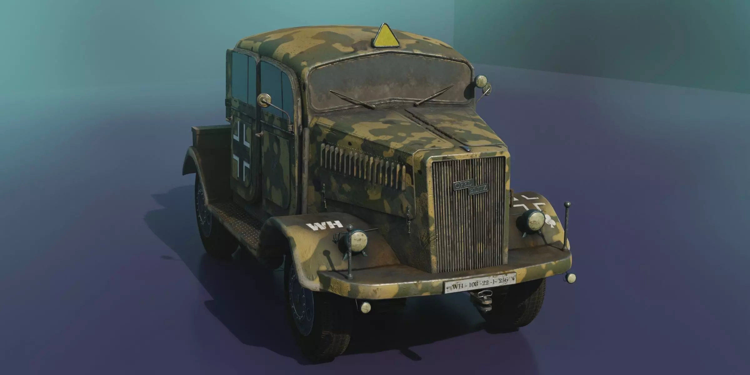 Opel Blitz truck - V2 rocket variantion with cammo.Game ready model for unreal, unity engine. For scenes, videos, games.Wheels with origins for animations2k PBR textures in substance painter