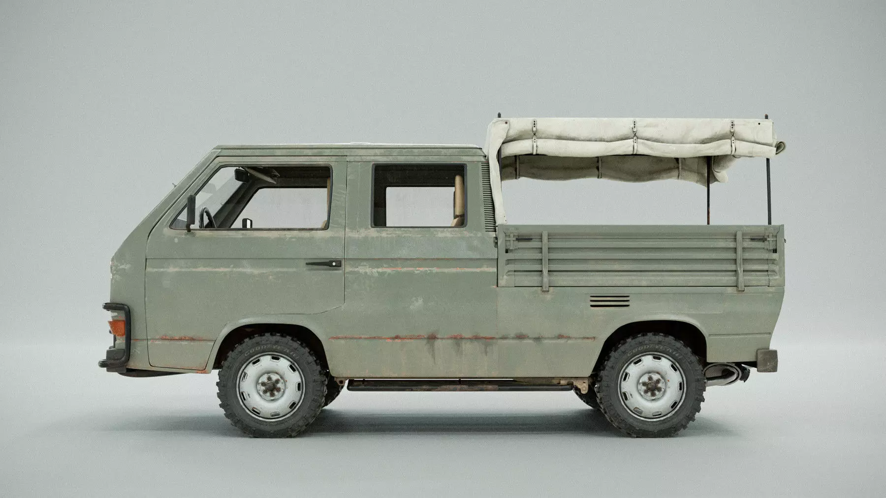 PBR 3D Model - Volkswagen T3 - Army Car Project. High poly, 32 UDIMs. Dirty & Clean Textures.