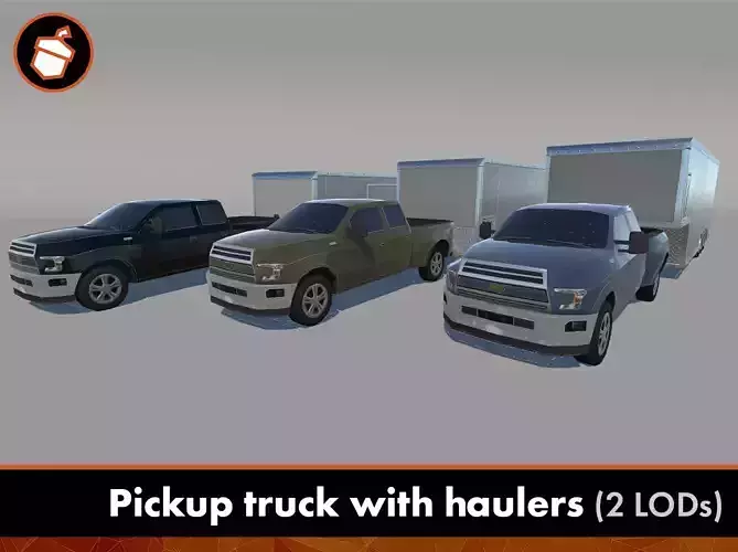 This pack includes 3 variations of haulers and 6 colors for the pickup truck. The haulers have a stand as a separate mesh allowing them to be used individually or as an attachment for the pickup truck.All models have 2 levels of detail (LOD), with 2 dedicated textures set for the wheels.