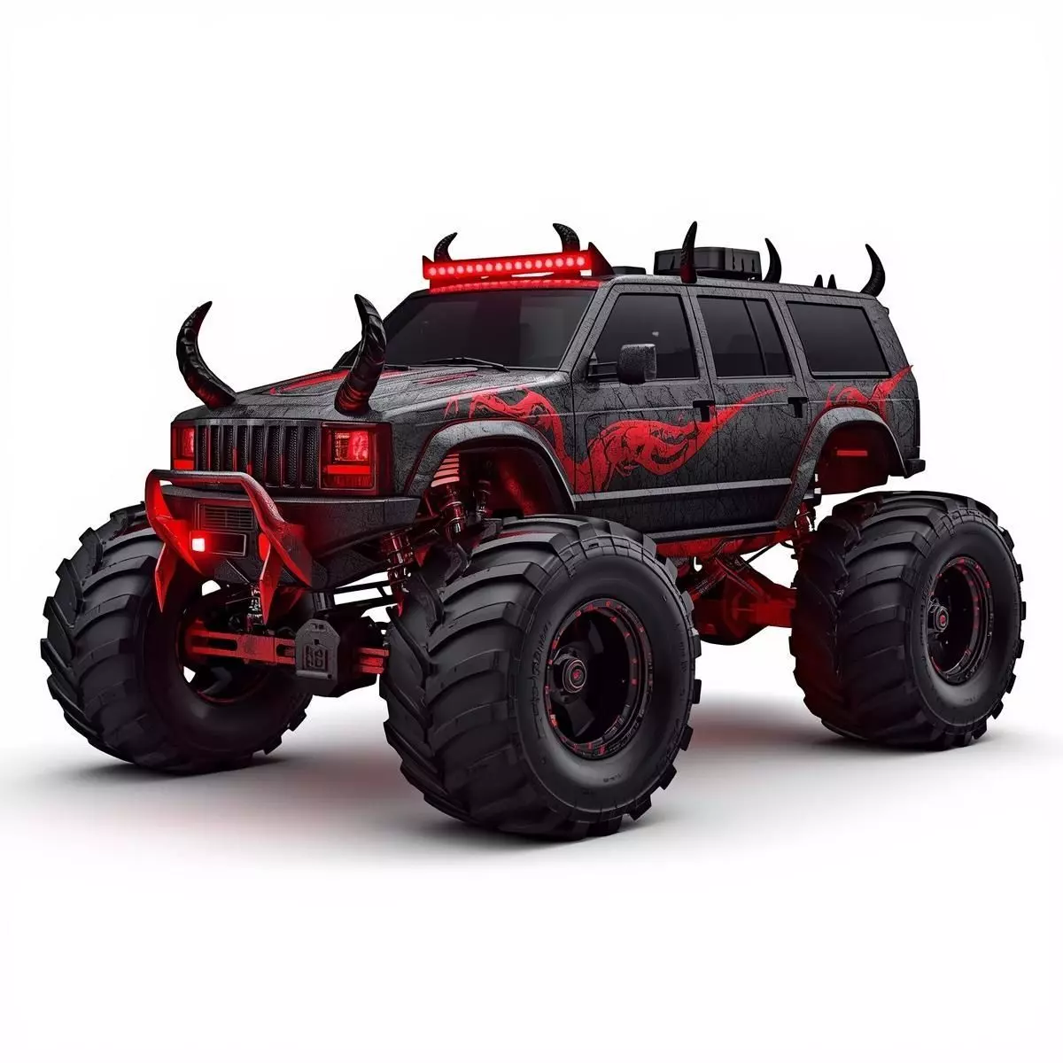 Tagsdemon truck, monster truck, horror vehicle, off-road, demonic horns, spiked car, 3d model, game asset, dark fantasy, weathered, glowing red, halloween, creepy, aggressive, glowing lights, realistic, supernatural, wasteland, 4x4 horror, 3d prop