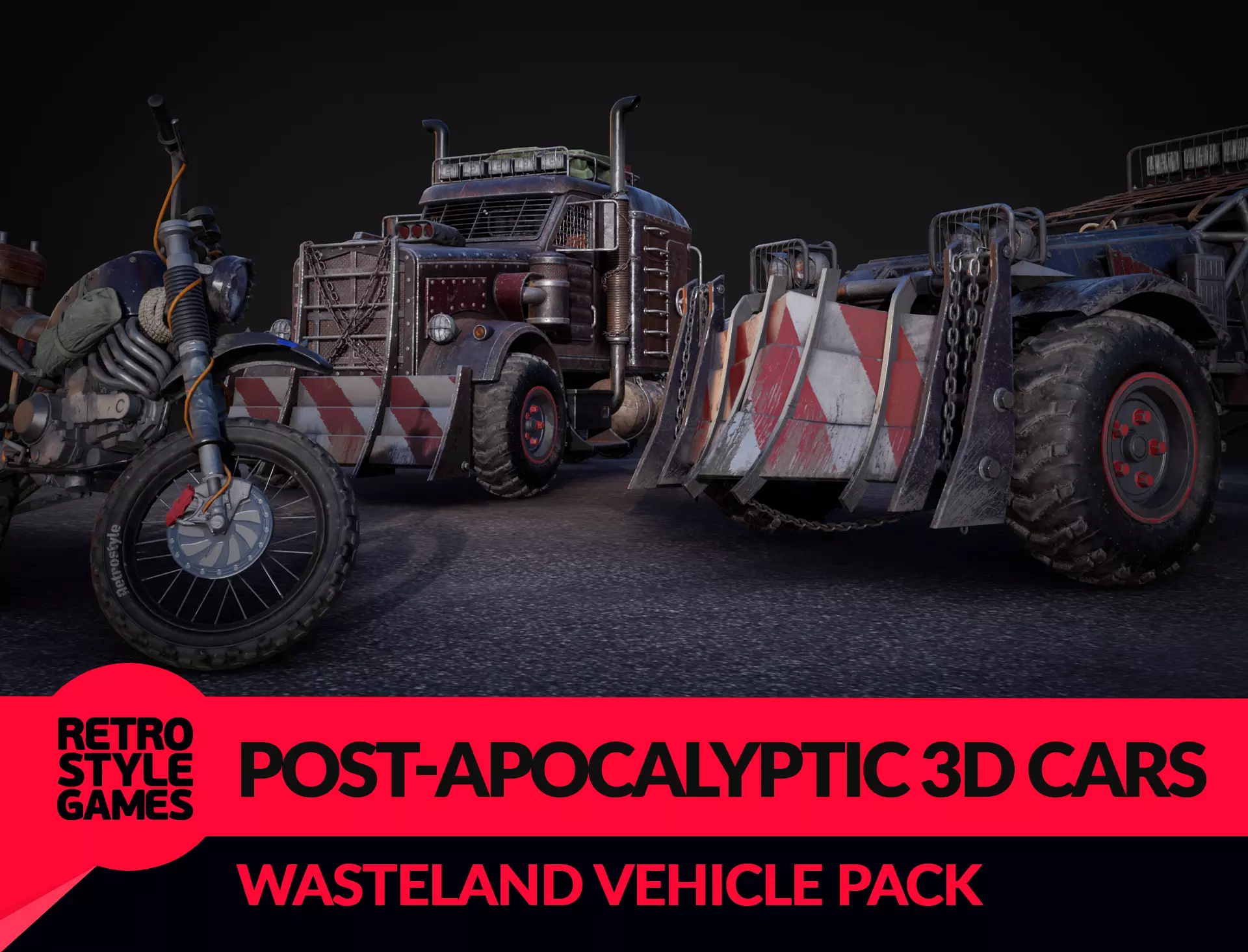 Post-Apocalyptic 3D Cars (WASTELAND VEHICLE PACK) is a set of three detailed vehicles: buggy, truck, and bike, built for survival and desert environments. The pack is inspired by Mad Max 3D models, Crossout 3D models, and Rage 2 vehicle 3D models.