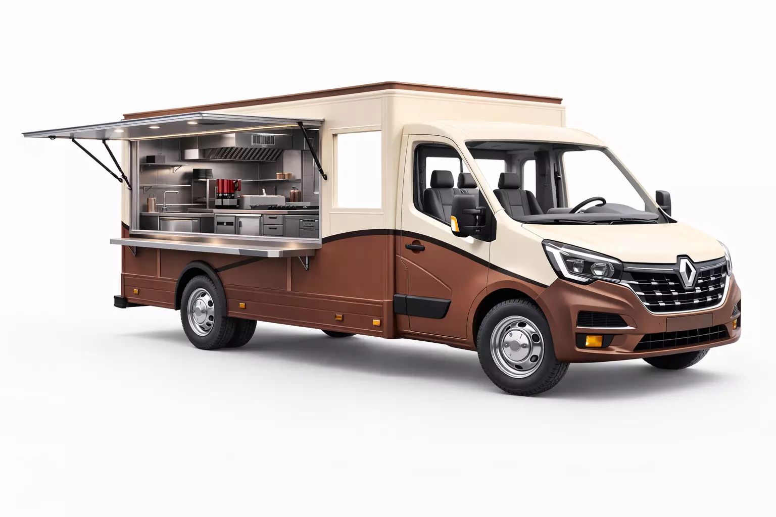 Low poly Renault Master food truck designed for street food scenes, urban environments and game projects. Mobile kitchen structure makes it ideal for city markets, festivals and food service scenarios.