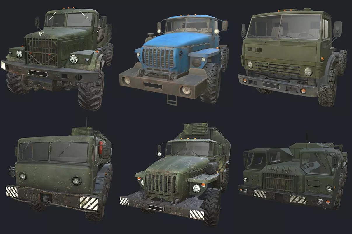 There are 6 models in this setKamaz 4310 / KRAZ 255 / MAZ 537 / MAZ 7310 / URAL 4320 / Ural 4320 Empty