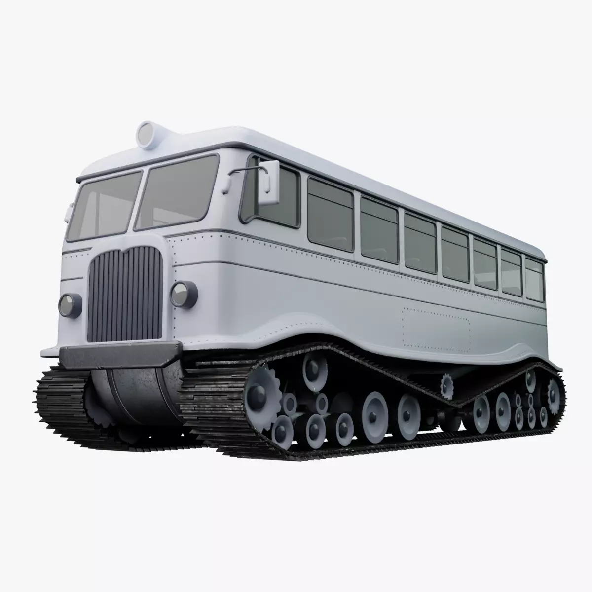 3D model of a snowcat bus designed for civilian use during the icy winter months, featuring a sleek and angular body with a white color scheme, equipped with motorized tracks for traversing through thick snow effortlessly.The model comes with 1-4k resolution texture packs.