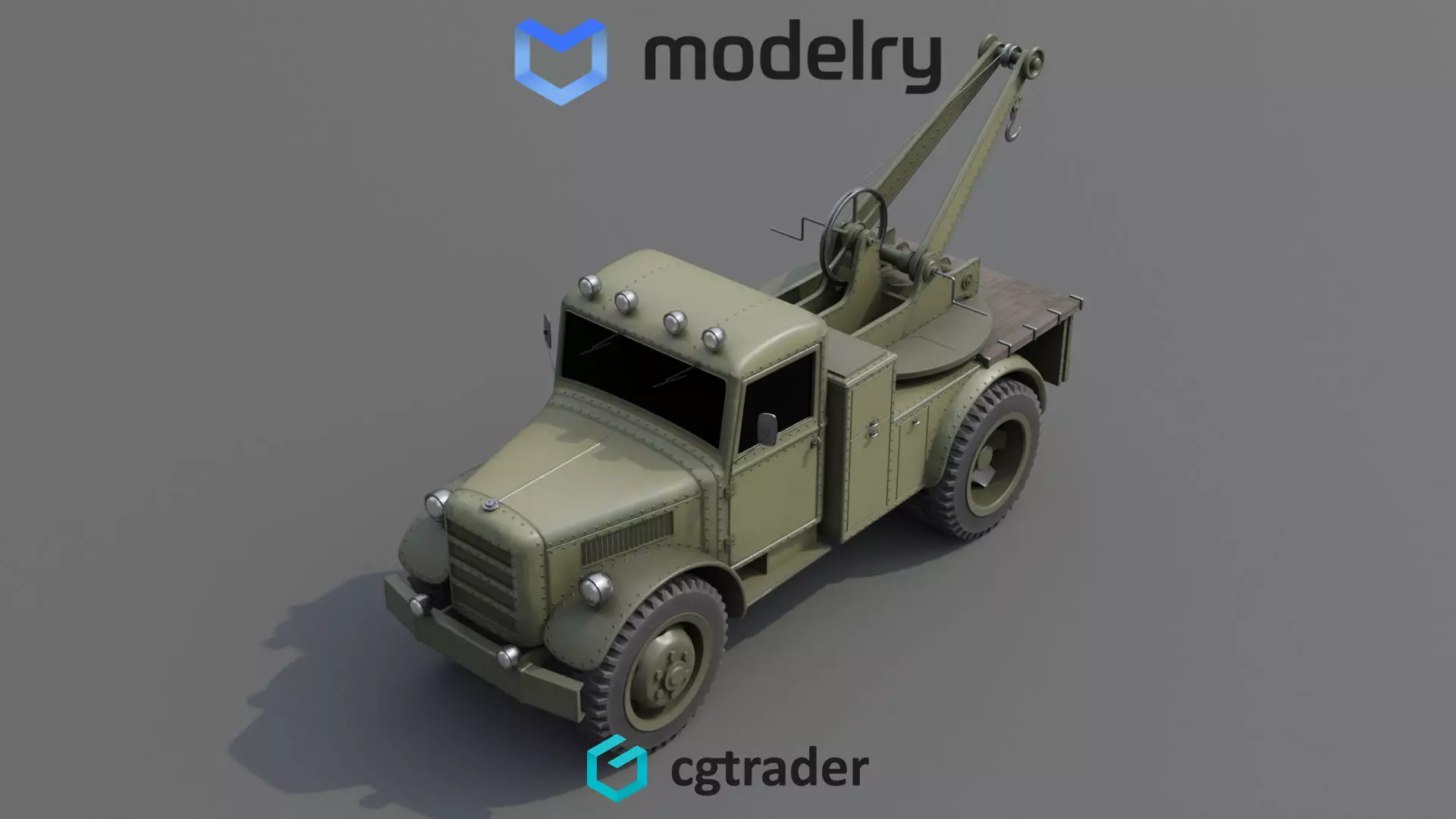 A vintage tow truck from the historical timeline, featuring a sturdy metal frame painted in a faded olive green color, with rust spots adding character to its rugged appearance. The large front grille is adorned with intricate detailing, while the oversized wheels are covered in mud splatters, hinting at its hardworking nature.