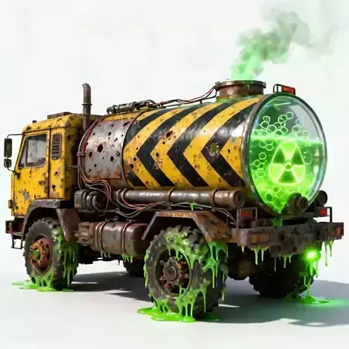 Description: Haul the most dangerous payload in the wasteland with the Toxic Tide Waste Tanker. Essential for post-apocalyptic transport missions, industrial hazard levels, or zombie survival scenarios, this vehicle is a ticking time bomb on wheels. The truck features a battered, military-industrial yellow cab that has seen better days, now rusted and bullet-riddled. Its primary feature is the massive, reinforced glass tank on the rear, which blatantly displays its cargo: bubbling, glowing radioactive sludge that is actively leaking, leaving a trail of death wherever it drives.