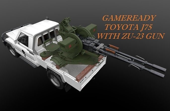 Lowpoly model of Toyota Land Cruiser FZ J70 pickup with Russian anti-aircraft gun ZU-23 (caliber 23 mm, GRAU index 2A13) including interrior and parts of shassis made in Blender 2.83, all textures made in Substance Painter .