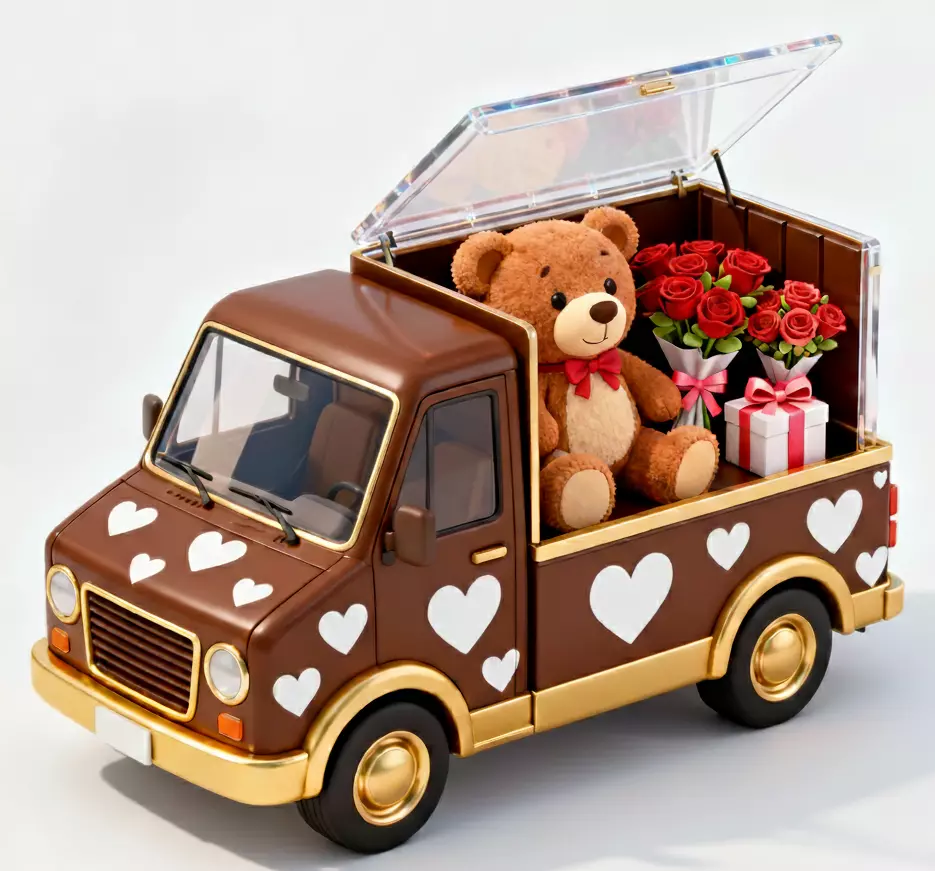 The Overall Concept This asset reimagines a compact utility truck as a Love Delivery vehicle. It combines a rich chocolate-brown base with playful heart motifs and a transparent cargo hold, turning a standard transport model into a whimsical gift-on-wheels.