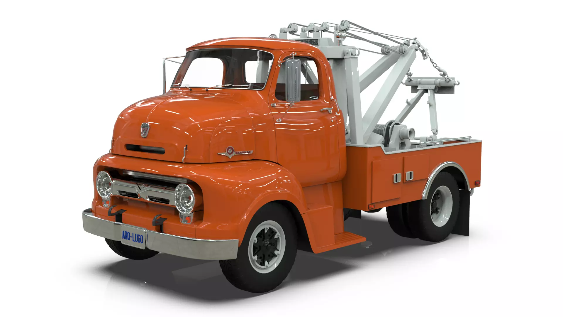 This meticulously crafted 3D model showcases a classic 1950s Cab-Over-Engine (COE) Tow Truck, featuring an authentic Holmes 750 wrecker system on a single axle chassis. Modeled in Blender from precise blueprints, this asset is optimized for digital projects including video games, architectural visualizations, film productions, and real-time simulations.