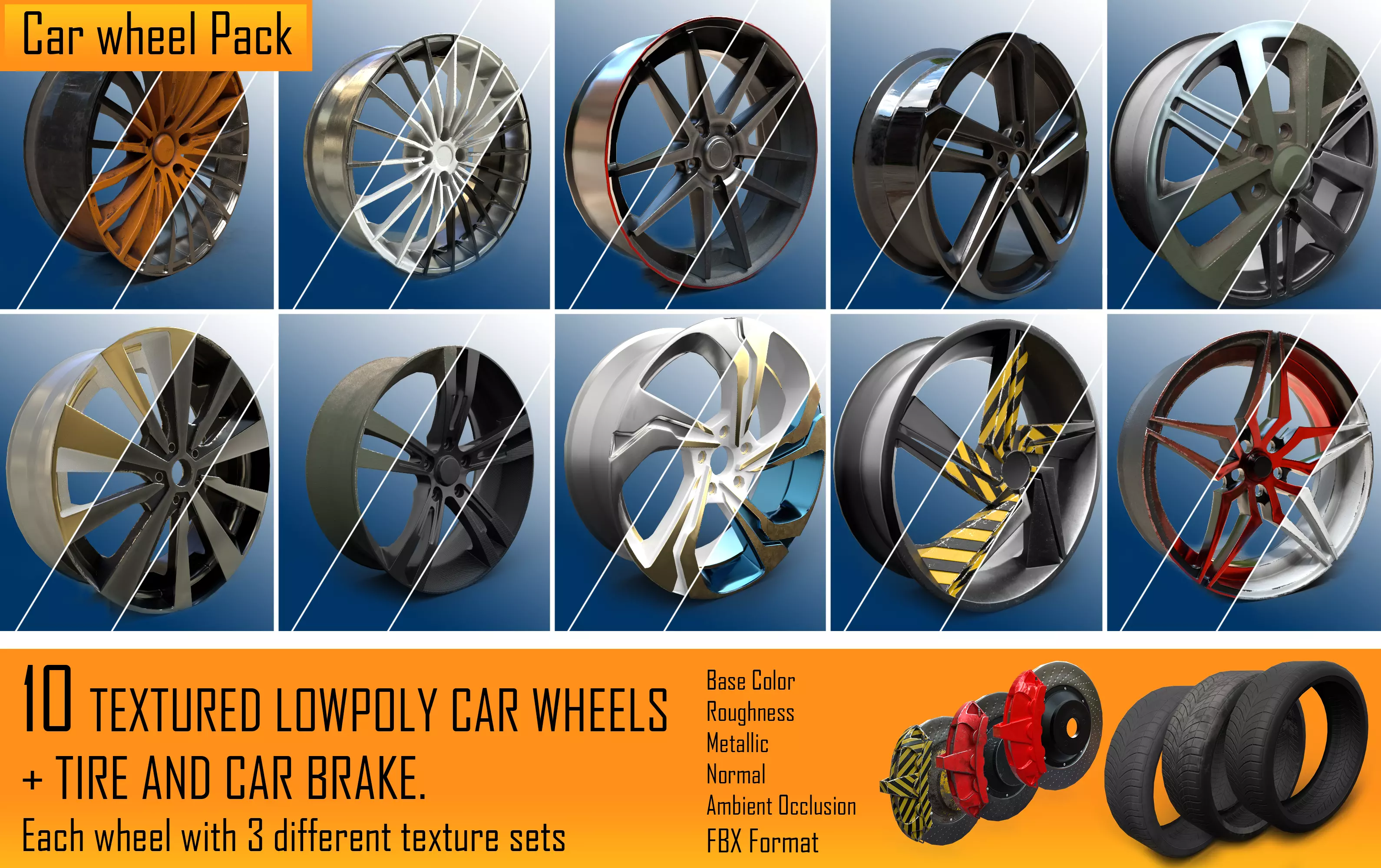 This pack contains 10 car rims, one car brake & one tire 3D models in FBX, OBJ, STL format. All 3D models include two versions of geometry: Highpoly and LowpolyEvery model has 3 different PBR texture sets (Base Color, Roughness, Metallic, Normal & Ambient Occlusion)
