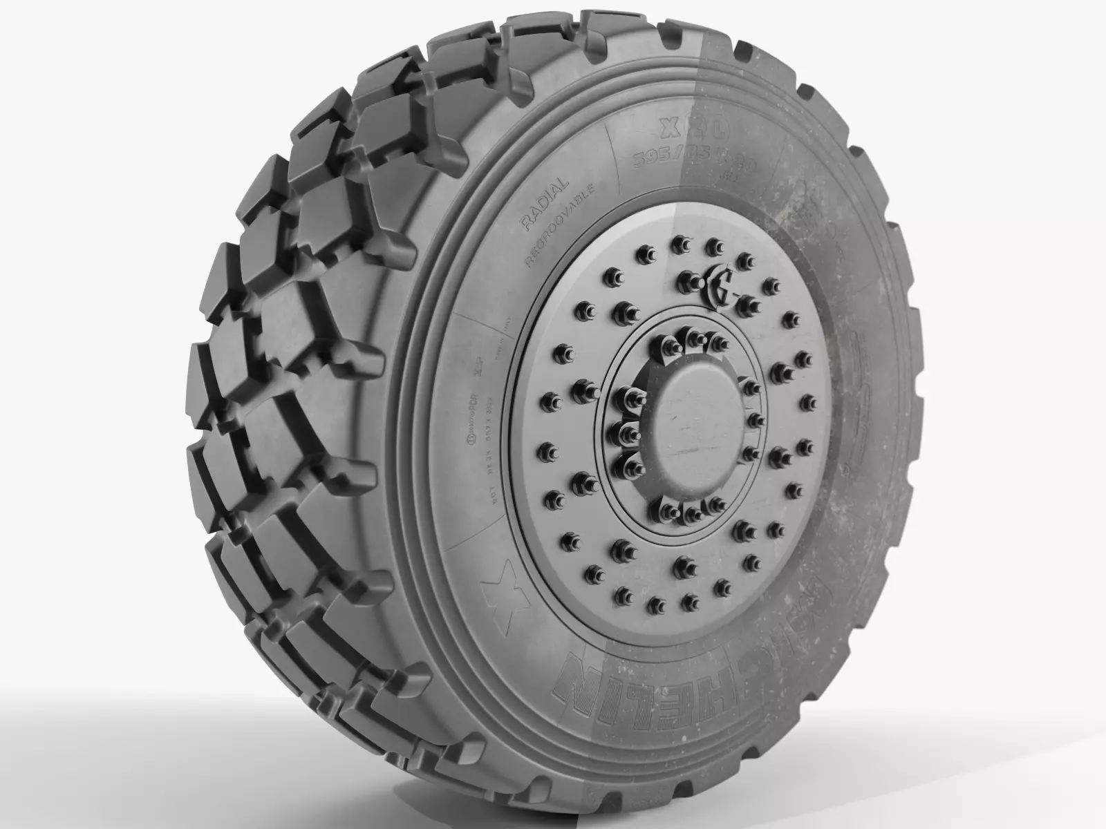This is a highpoly 3d model of a Michelin XZL 395/85 R20 heavy duty/military tire which stands out with a clear topology, detailed textures.Information: