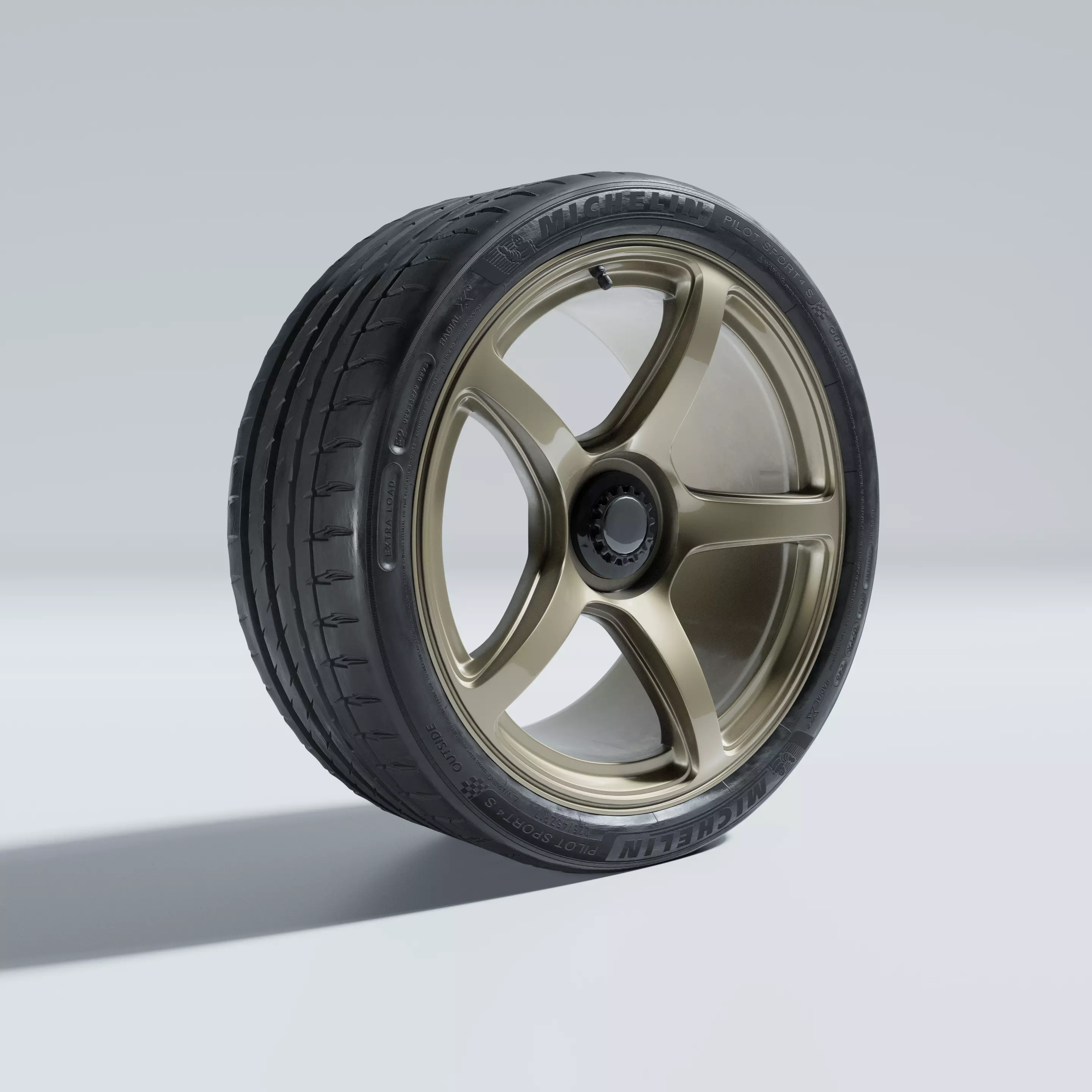 This is a high-quality 3D model of a bronze 5-spoke car wheel paired with a Michelin Pilot Sport 4S performance tire. The model is ideal for high-end automotive visualizations, animations, and real-time applications. The details include embossed text on the tire sidewall, accurate tread patterns, valve stem, and realistic shading.