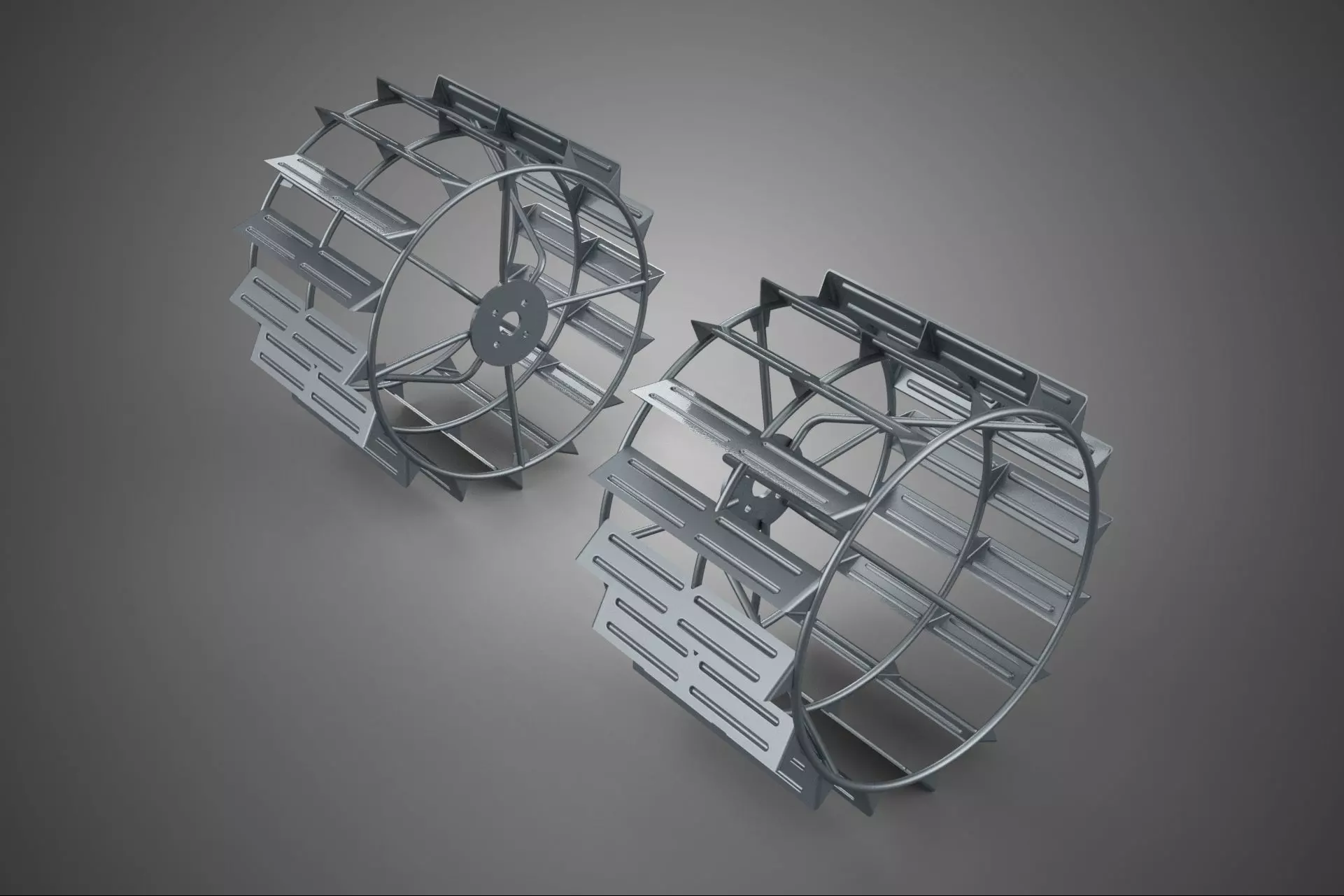 The primary structure consists of a rigid, open skeletal framework—the metal cage—typically constructed from welded high-tensile steel alloys. This cage connects the hub assembly to the exterior ground-engaging elements. The open design is critical for operational efficiency, allowing rapid shedding of mud, water, and debris, preventing hydrostatic resistance and maintaining a consistent interface with the soil.
