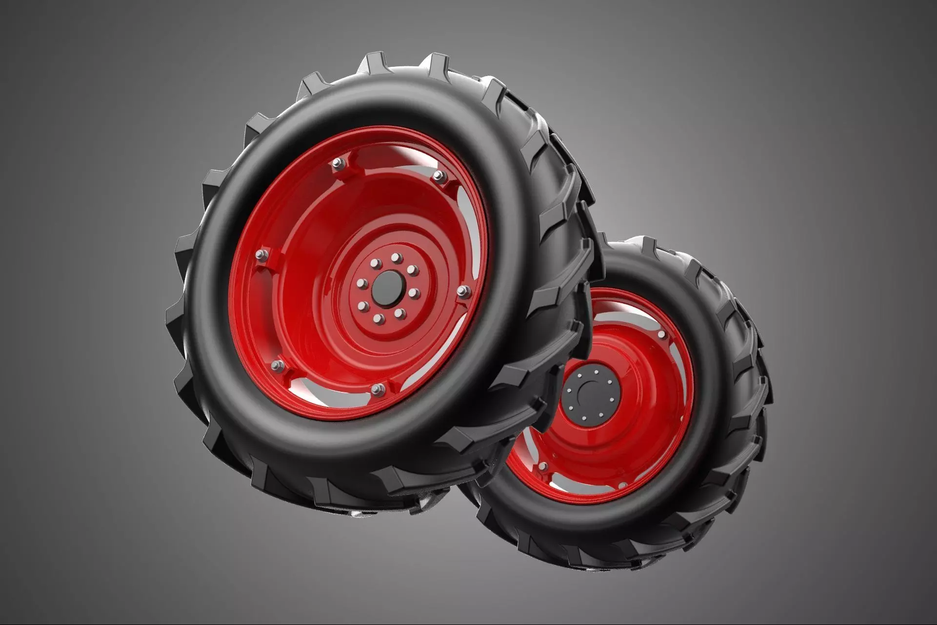KEYWORDS: Tractor, Agricultural, Wheel Assembly, Tire, Tyre, Lug, Tread, Rim, Disc, Hub, Rubber, Traction, R-1, R-2, Flotation, Soil Compaction, Load Bearing, Pneumatic, Axial Load, Radial Ply, Bias Ply, Steel Rim, Self-Cleaning, Agricultural Engineering, Ballast, Torque Transfer, Farm Equipment, Component, Red Paint, Durability.