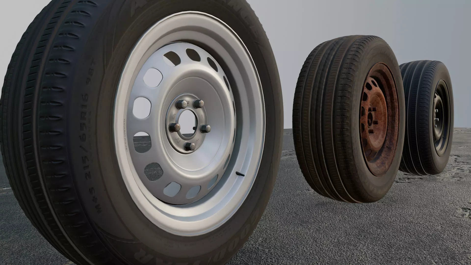 • Includes a rusty wheel with an old dirty tire as well as a darker wheel.