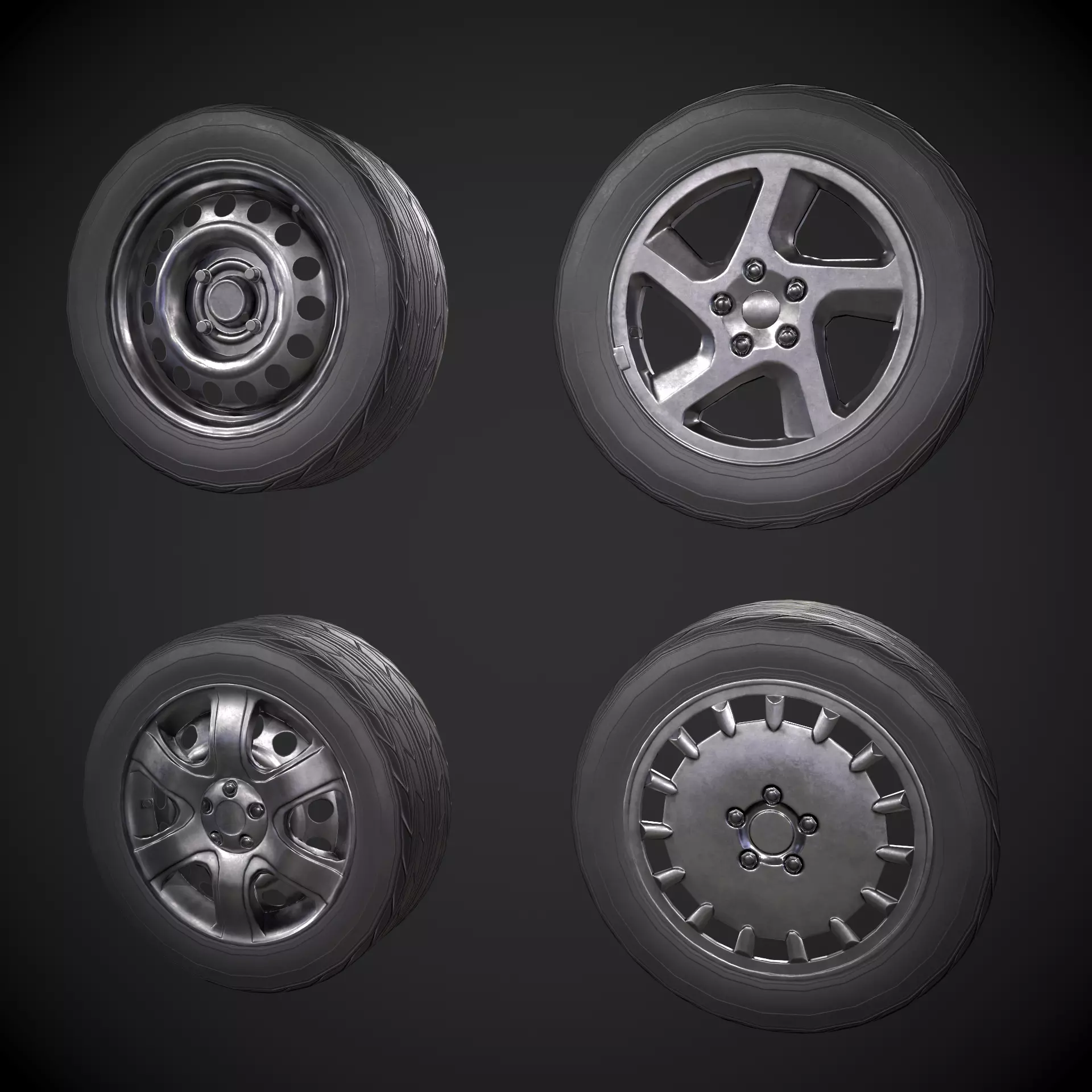 Game-ready Car Tires asset of four tires, with PBR textures included in the files. This has 2253 polys (3937 tris) and 2186 vertices. Rear of the tire is just a mirrored rim on flat surface.