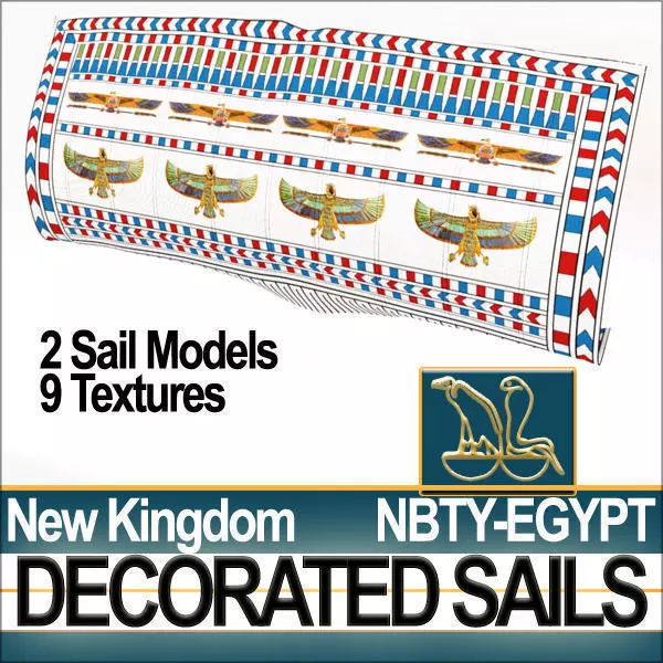 Ancient Egyptian New Kingdom Real Decorated Sails Models and 9 Hi-DEF UV Maps textures with Original Typical NK Egyptian Decoration Patterns and Linen Shader. C4D, VUE6 to12 , 3DS, OBJ!______________________________________________To be used with CgTrader Product ID 74822 [Ancient Egypt Pharaoh Royal Ship New ]