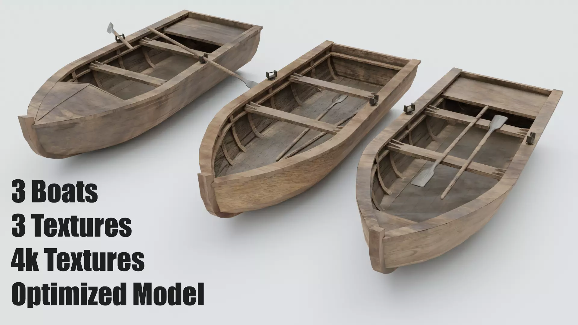 This pack includes 3 detailed wooden boat models, each designed for game-ready use and optimized for real-time performance. Every model averages around 4,000 triangles, providing a good balance between visual quality and efficiency. All assets are fully** UV unwrapped and use 4K PBR textures** (Base Color, Roughness, Normal, and Metallic).